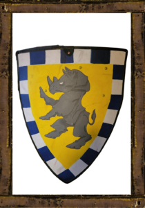 Or, a rhinoceros rampant sable and a bordure compony azure and argent.